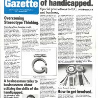 (attached to item 50) a 2 page (double sided) newsletter called "Guild Gazette" with the tag line "Marketing the skills and products of B.C. Handicapped. Inside are pictures of various craft made items by disabled craftspeople. Note on top of newsletter reads: "M for June. send to to Gail Rogers - would that Econ. Deu (?) would do this kind of promo for crafts!! Found at the welfare office in Chilliwack"