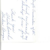 card with flowers and green border printed on the front. Inside reads: "To the Crafts Association of BC Please find enclosed my membership fees for 1996. Thank you Sheila Beech Sladen Designs"