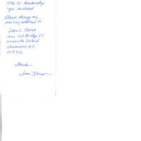 (found in item 358) Short note on Canadian Crafts Council note paper providing an address for Jean L. Kares and enclosing 1996-97 membership