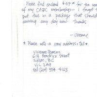 Letter from Vivienne Pearson providing $47 for membership renewal and noting a new address. (nothing found with letter)