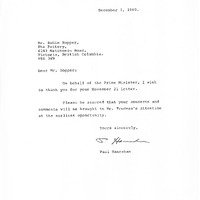 typed Letter from Paul Hanrahan (office of the Prime Minister) to Robin Hopper thanking for the letter sent on 21 November 1980 and assuring the comments and concerns will be brought to Trudeau's attention