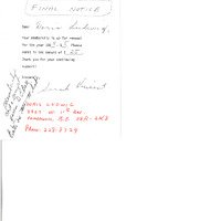 Typed letter from Sarah Vincent as a final notice to Doris Ludwig about membership renewal. Notes at bottom read: “Membership card + receipt given to D. E. Bell. Enter (?) new M. List” and an address / phone number for Doris Ludwig