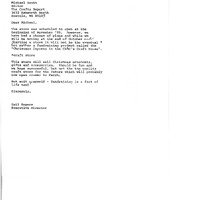 (attached to item 41) Drafted typed letter from Gail Rogers in response to Michael Scott writing that the full Crafthouse won't be open until March 1986, but a Christmas market-esque shop will be open in Crafthouse as a fundraiser by the end of october. Back page is a photocopied informational article about CABC programming