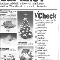 (attached to item 50) a 2 page (double sided) newsletter called "Guild Gazette" with the tag line "Marketing the skills and products of B.C. Handicapped. Inside are pictures of various craft made items by disabled craftspeople. Note on top of newsletter reads: "M for June. send to to Gail Rogers - would that Econ. Deu (?) would do this kind of promo for crafts!! Found at the welfare office in Chilliwack"