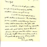 written note to Gail from Kerry Joe Kelly (?) regarding a possible slide lecture taking place in Vancouver - written on a yellow piece of 'karolli institute' paper