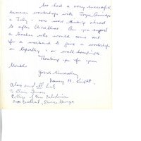 (attached to item 199) written letter from Nancy Knight regarding a previous summer workshop with Joyce and requesting information for teachers who may be available after christmas