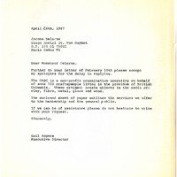 Possibly draft typed letter (some parts whited out with hand written letters replaced) from Gail Rogers to Jerome Delarue of Aux Trois Quartiers replying to his letter. Explaining what the CCBC does. Typed on Canadian Craft Council Conférence 86 stock paper