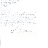 Handwritten letter from Pam + Walter Hart to the CABC inquiring after joining the CABC as Walter is a craftsperson. Note at bottom reads: "Replied to:"