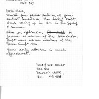 Handwritten letter from Dale and Sue Brocke to the CABC asking for a list of craft shows and an application to become a member of the CABC